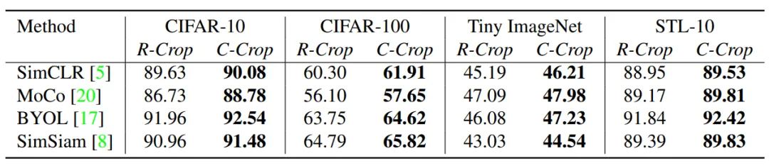 表1对比了RandomCrop (R-Crop)和ContrastiveCrop (C-Crop)在一些小规模数据集上的线性分类表现。对于不同数据集和不同对比学习方法,ContrastiveCrop稳定比RandomCrop高了0.4%~2.0%分类准确率。
