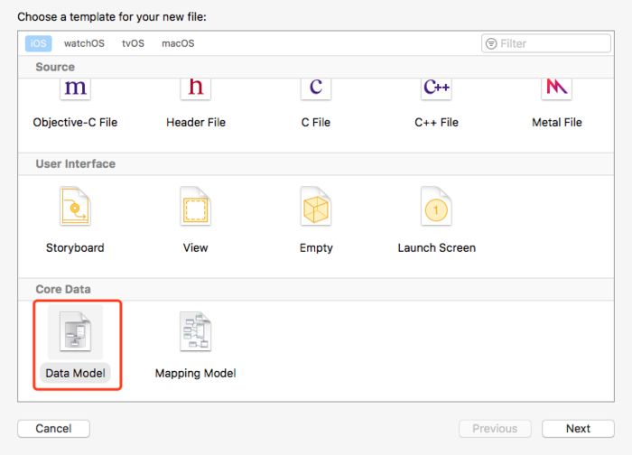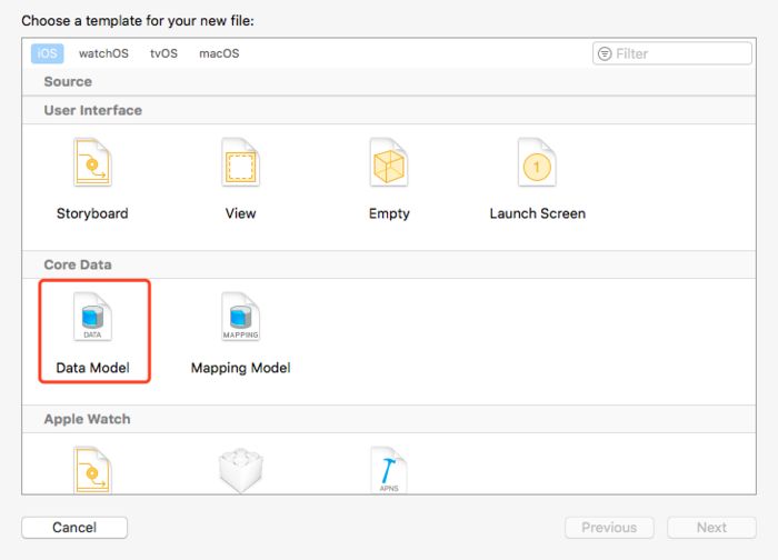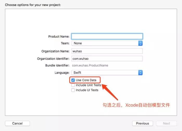 创建项目的时候,勾选下图中的Use Core Data选项,工程中会自动创建一个数据模型文件。当然,你也可以在开发中自己手动创建。