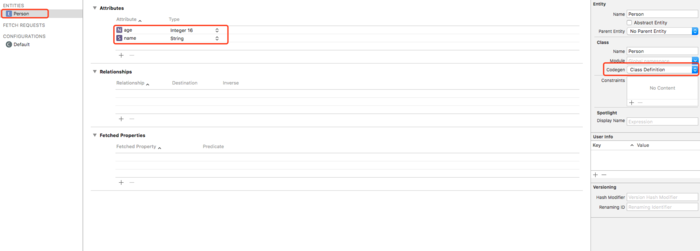 2.创建Person表,两个属性name和age,注意右侧的Codegen我们这里选择Class Definition,然后直接Command+B编译代码,Xcode会自动帮我们生成Person+CoreDataClass.swift和Person+CoreDataProperties.swift文件