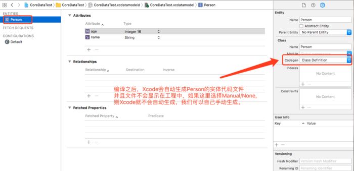 编译之后,Xcode会自动生成Person的实体代码文件,并且文件不会显示在工程中,如果下图中右侧Codegen选择Manual/None,则Xcode就不会自动生成代码,我们可以自己手动生成。