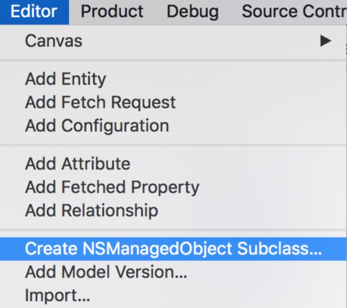 手动生成实体类代码,选中CoreDataTest.xcdatamodeld文件,然后在Mac菜单栏中选择Editor,如下图所示。一路Next就可以了。