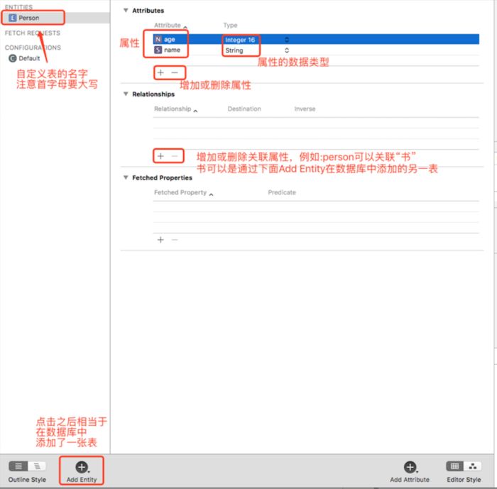 点击Add Entity之后,相当一张数据表。表的名称自己在上方定义,注意首字母要大写。