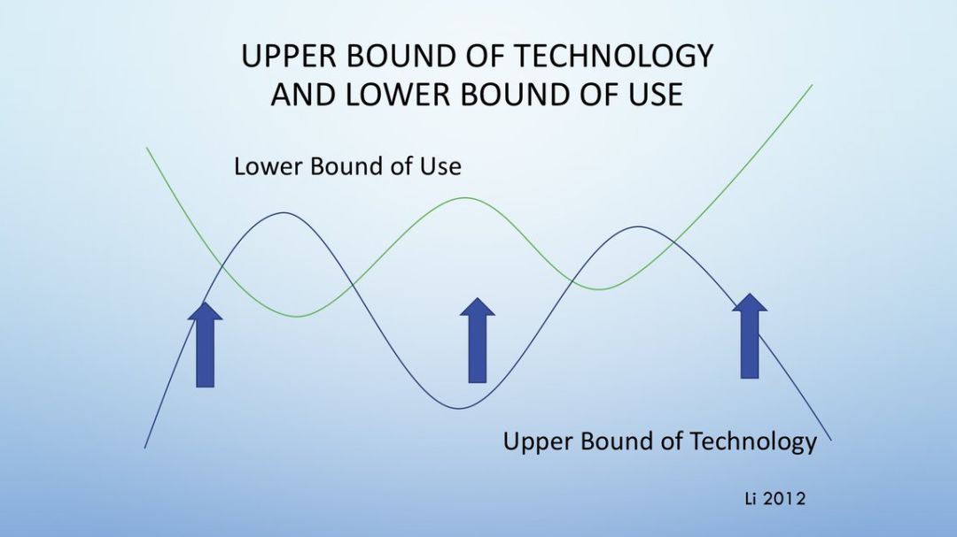 另一方面,虽然技术永远在不断进步,但是不一定能够满足用户的需求。有两个概念,叫做技术的上界和使用的下界。比如说技术性能指标中的准确率,随着技术在不断进步,性能的上界也不断的提高,但是用户使用的时候主要关注的是下界,准确率达不到一定水平的话,用户不愿意使用的。