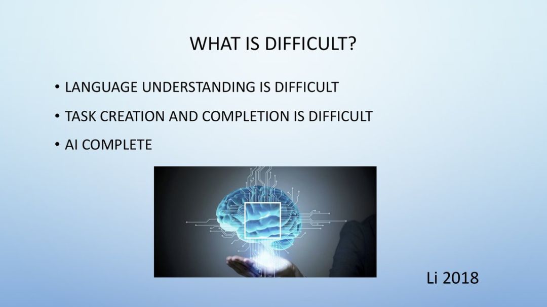 为什么自然语言对话非常困难,总结起来有两个问题非常难解决,如果能够解决,就可以实现人类一样的智能。