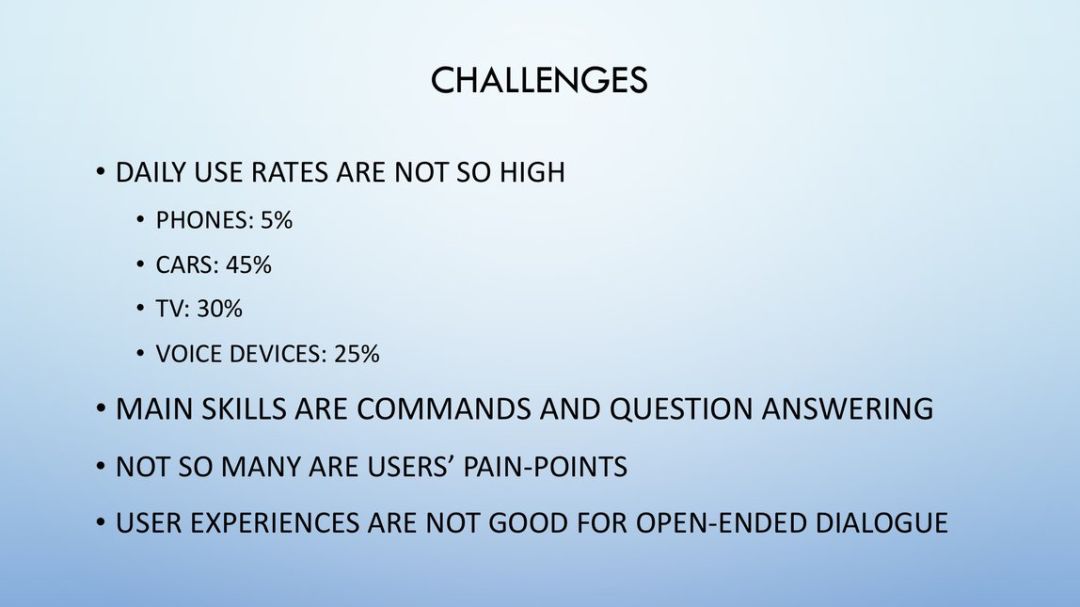 但是市场调查也发现,真正使用语音助手的用户并不是特别多。例如,尽管智能手机上基本都有语音助手,但是大概只有 5% 的用户使用或使用过这样的技术。