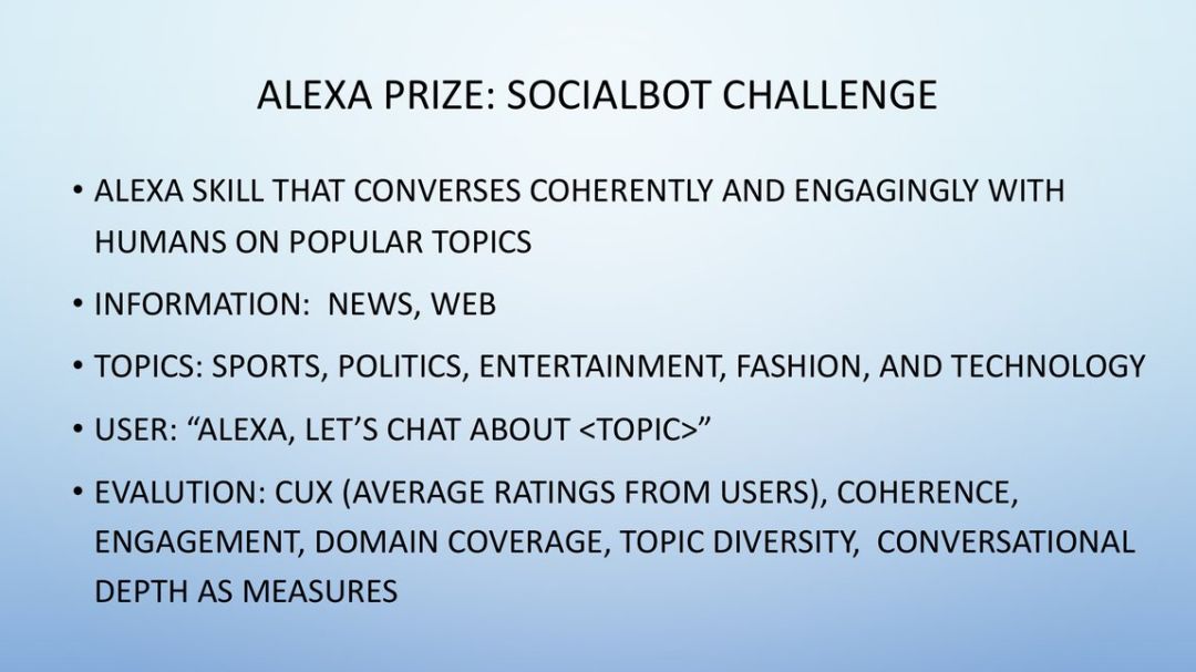 在信息类机器人方面,已经有一些公司在开发这样的产品。比如,亚马逊的 Alexa 智能音箱。亚马逊近几年还举办了一个 Alexa Price 比赛,邀请大学的老师和同学参加。在任务上,这个音箱机器人不是传统意义上的明显需要完成任务的机器人,而是进行信息交互,让音箱机器人可以在互联网、社交媒体找到各种有趣的信息,和用户进行对话。虽然有时候对话的完成情况并不理想,但是很有意思,能够帮助用户更好的获得信息。