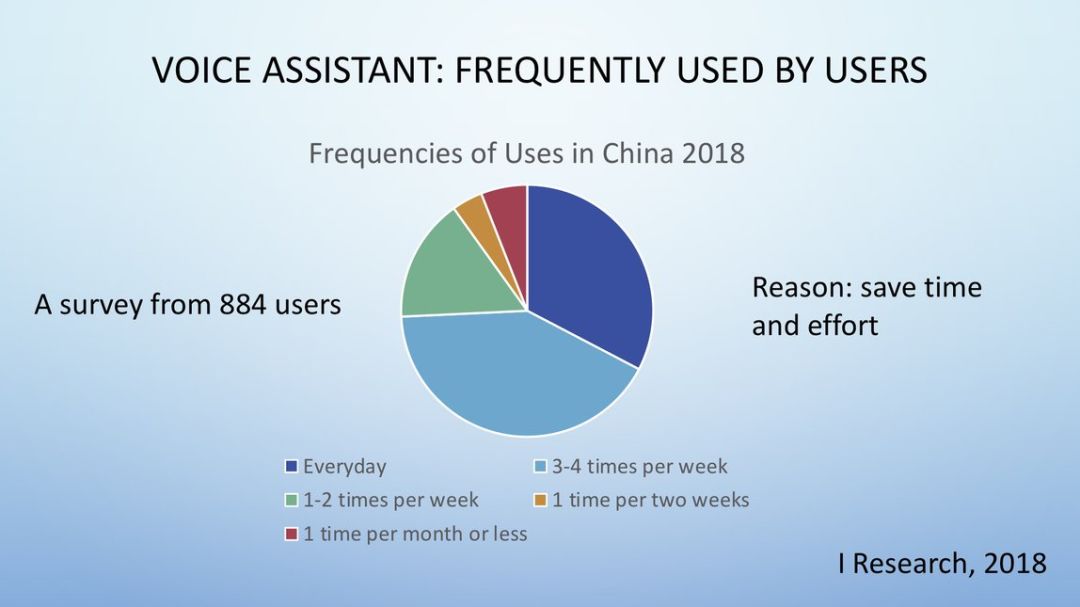对话技术已经在市场上开始普及。在国内,有调查显示,在去年每天使用语音助手的用户中,频繁使用的用户(每天使用和每周使用语音助手的用户)可以占总用户数量的 3/4 左右。