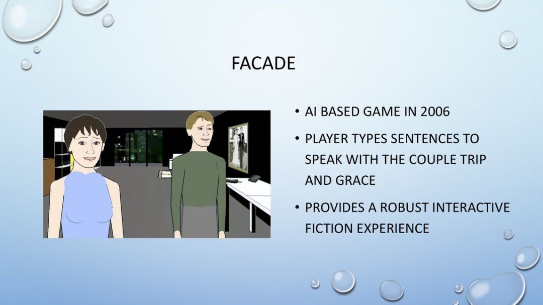 对话系统还有一种机会就是在游戏里面。比如说,这个是比较古老的游戏,叫做 facade。有一对夫妇住在一个公寓里面,玩家可以进入这个公寓,两个夫妇正在吵架,玩家需要敲键盘,用英语跟他们对话。聊天对话的结果有两种,一种是帮助这两个人和好,一种是帮助这两个人分手,还有一种是用户说话的时候得罪了这两个人,最后被赶出房间。大家都说这个游戏设计得很有意思,得了很多奖。