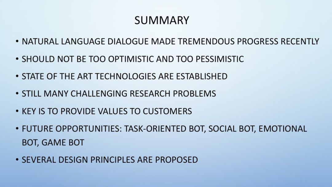 但是我们有希望,而且还有很多的商业机会,重点是一定要考虑到怎么样给用户带来真正的价值,这是发明创造的核心。我们看到业界已经有这样趋势,不仅仅是传统的完成任务方面的对话系统,在信息分享、情感、游戏等领域中,对话系统都有很大的发展前景。当然,我们在设计这样的系统时,应该遵循几个原则。系统在一个场景里应该尽量自封闭、能够优雅的失败、能够加入情感社交的因素、尽量不要假装智能。谢谢大家!