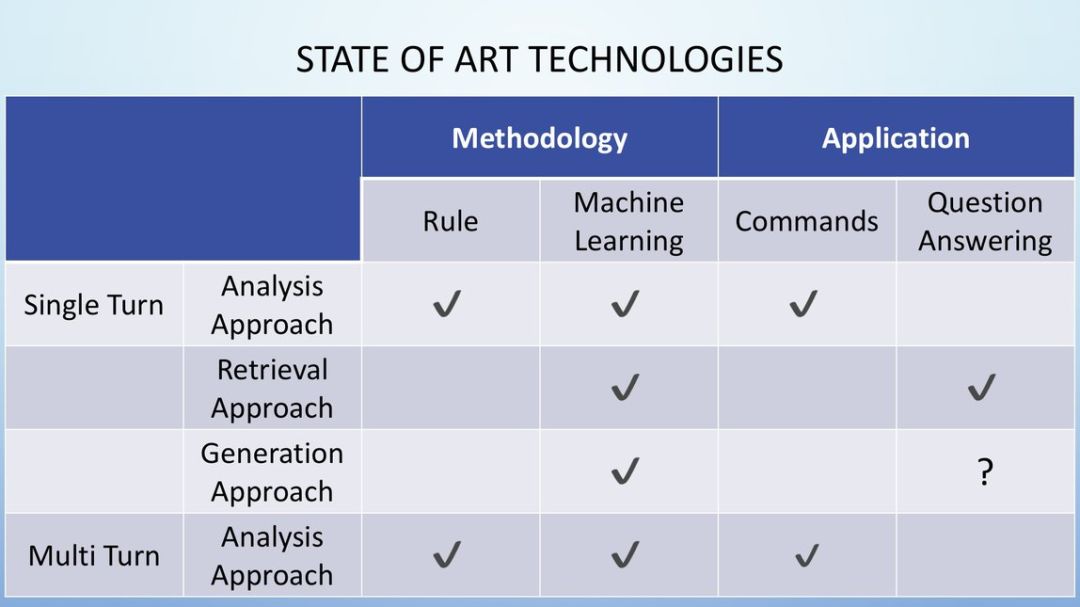 划分一下对话技术,大概可以分成这样几个方面。首先是有应用,基本上分为命令和问答。这两点目前已经可以完成得很好了。在实现方法上可以基于规则或基于机器学习来实现。如果没有数据,可能需要使用规则,有数据的情况下则使用机器学习。从对话技术来说,又可以分为单轮多轮技术。更具体的来说,有基于分析、检索或基于生成的技术,可以应用在不同的场景中。