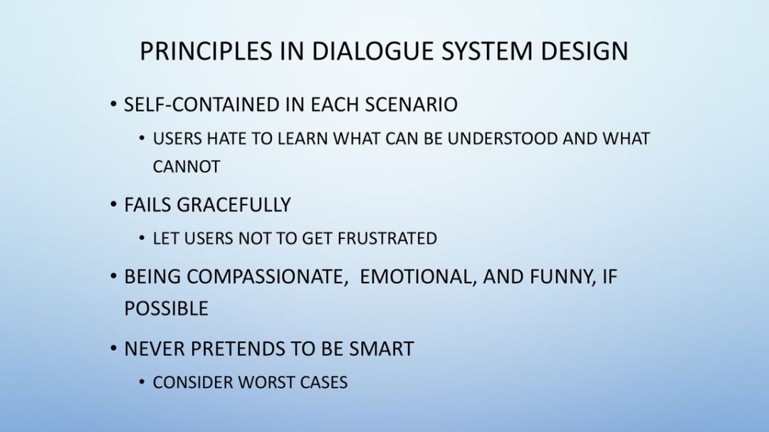 现在我分享个人总结的在字节跳动和以前华为工作的一些经验,设计对话系统中应该遵循的原理或者规则。大概有四条。
