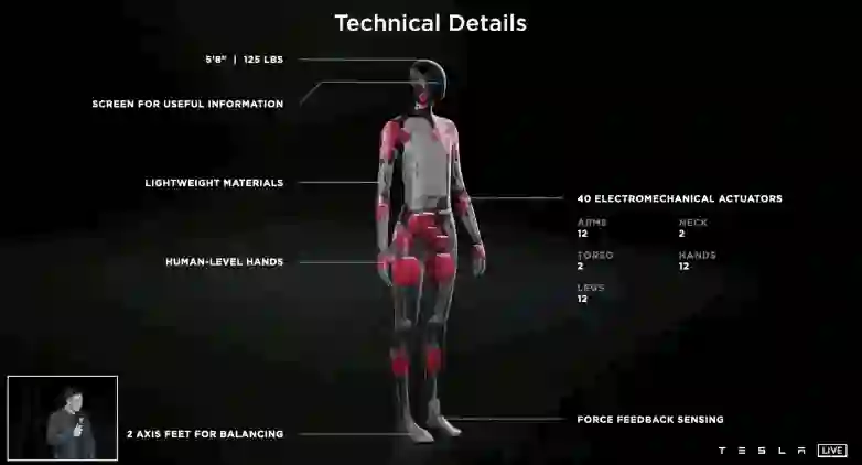 具体来看,Tesla Bot搭载FSD计算机和Autopilot摄像头,全身上下共有40个关节,两只脚有力反馈感应,特斯拉汽车中的几乎所有传感器也都会被使用到该机器人中。