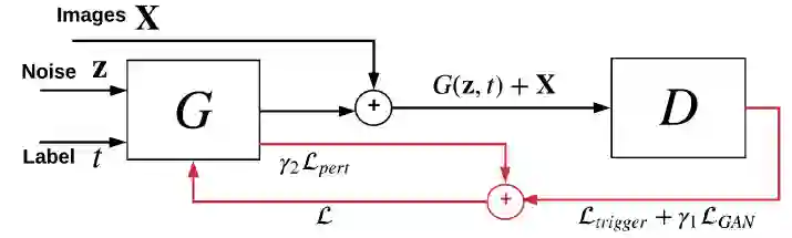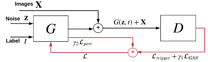 2. 利用生成模型来重建特洛伊木马攻可能使用的触发器图案。由于攻击目标(受感染的输出类)对于防御者是未知的,因此使用条件生成器 G(z,t) 来有效地构建对不同攻击目标的触发器。其中 z 是一个随机噪声向量,t 是一个目标类别。G 被用于训练来学习触发器分布,这意味着被检测的 DNN 应该在反向数据样本 x 上叠加 G 的输出来预测攻击目标 t。条件 GAN 的训练过程如图 3.3 所示,训练目标为 D(X+G(z,t))=t,D 是待检测的 DNN,t 是攻击目标,x 是来自模型反演获得的近似数据分布 Px 的样本,触发器是条件生成器的输出。