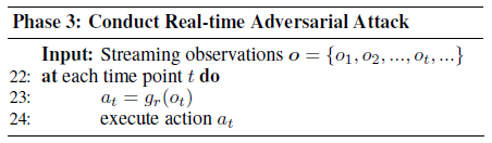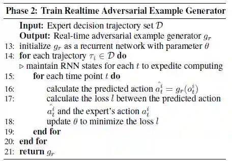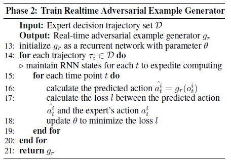 具体的实时对抗攻击算法分为 3 个阶段,如图 2.2 算法描述所示,第一步是生成 Expert Demonstrations,第二步是训练实时对抗样本生成器,第三步是执行实时对抗攻击。