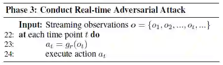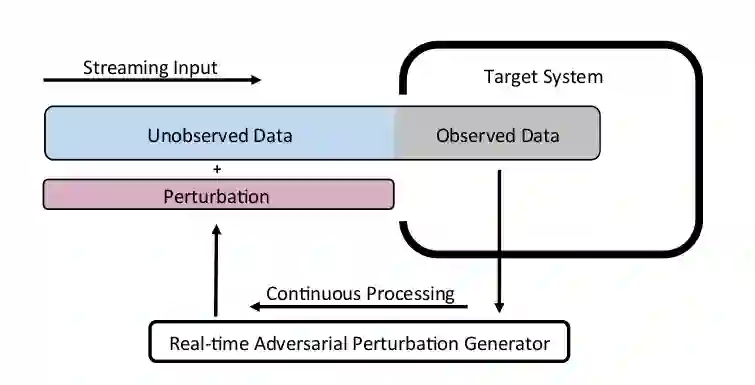 机器学习算法易受到对抗扰动攻击,对输入添加微小但精心设计的扰动可能使模型失败。虽然现有的攻击方法已经非常有效,但它们只关注目标模型采用静态输入的情况,即攻击者可以观察整个原始样本,然后在样本的任何点添加扰动。但这些攻击方法不适用于目标模型采用流输入的情境,即攻击者只能观察过去的数据点并向输入的剩余(未观察到的)数据点添加扰动。*本文提出了实时对抗攻击的概念*,展示了如何通过设计实时扰动生成器来攻击基于流的机器学习模型,并通过实时语音处理案例证明了所提出方法的有效性。