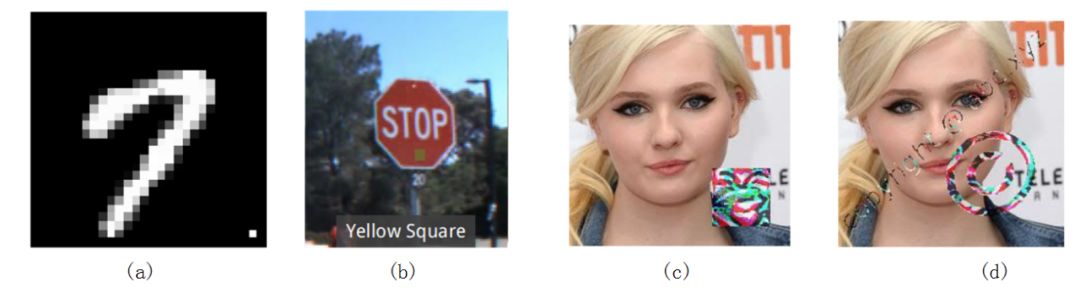 图 3.4 插入 trigger 后的图像举例。(a)Badnet 中在 MNIST 数据集中插入的方形 trigger (b)Badnet 中在交通标志牌上插入的黄色方形 trigger (c)Trojann 在 VGGFace 数据集上插入的方形 trigger (d)Trojann 在 VGGFace 上插入的水印 trigger. (a)(b) 来自论文 Badnets: Identifying vulnerabilities in the machine learning model supply chain. (c)(d) 来自论文 Trojaning attack on neural networks