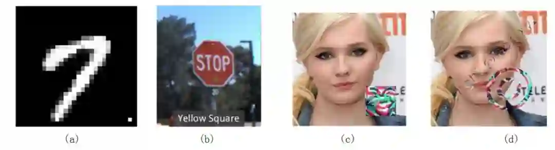 图 3.4 插入 trigger 后的图像举例。(a)Badnet 中在 MNIST 数据集中插入的方形 trigger (b)Badnet 中在交通标志牌上插入的黄色方形 trigger (c)Trojann 在 VGGFace 数据集上插入的方形 trigger (d)Trojann 在 VGGFace 上插入的水印 trigger. (a)(b) 来自论文 Badnets: Identifying vulnerabilities in the machine learning model supply chain. (c)(d) 来自论文 Trojaning attack on neural networks