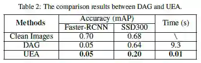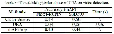 最后,让我们来看看本论文方法的实验结果。与 DAG 方法相比,UEA 对图像目标检测攻击的效果如 Table2 所示,在 Faster R-CNN 上表现和 DAG 持平,在 SSD300 上表现比 DAG 好的多,且用时仅 0.01s。UEA 方法在视频目标检测攻击的效果如 Table3 所示,在 Faster-RCNN 和 SSD300 上分别使得 mAP 值下降了 0.4 和 0.44,且用时仅 0.3s,证明了本方法对视频目标检测实现了有效的攻击。