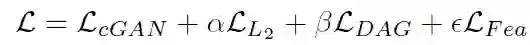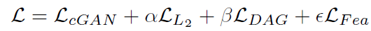 UEA 训练框架如图 1.2 所示,总的损失函数由四个部分组成,GAN 的目标函数,用于约束对抗样本和原图相似性的 L2 损失函数,同时采用 DAG 方法中提出的高级类损失,和本文作者提出的低级多尺度 attention 损失,共同制定到了 GAN 的框架中,以联合训练生成器。