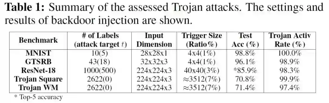 在介绍了方法之后,我们来看看实验。作者首先使用不同的 Benchmark 数据复现了两种典型的特洛伊攻击。1. 使用 MNIST 手写数字数据集和 GTSRB 交通标志牌数据集在对应的 DNN 分类模型上实现了 BadNets 攻击。2. 使用添加了方形 trigger 和水印 trigger 的 VGGFace 人脸数据集在 VGG16 和 ImageNet1000 在 ResNet-18 上实现了 TrojanNN 攻击。