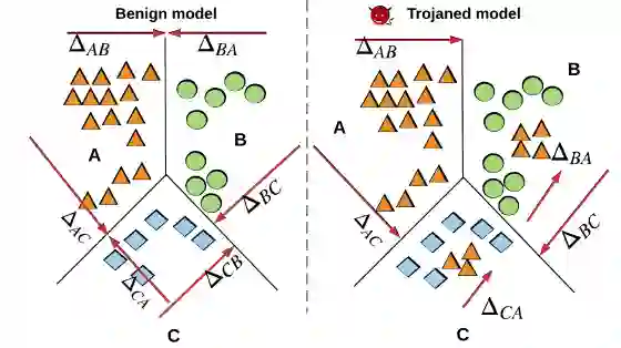 特洛伊木马插入过程可以被视为在合法数据点附近添加新的数据点并将其标记为攻击目标。从原始数据点到恶意数据点的移动是后门攻击中使用的触发器。作为特洛伊木马插入的结果,可以从图 3.1 中观察到,将合法数据转换为属于攻击目标类别的样本所需的扰动与相应的良性模型中相比较小。如何理解呢?考虑三分类问题,设ΔAB 表示将 A 类中的所有数据样本移动到 B 类所需的扰动,ΔA 表示将所有其他类中的数据点变换为 A 类的扰动:ΔA= max(ΔBA,ΔCA)。具有攻击目标 A 的特洛伊模型满足:ΔA<<ΔB,ΔC,而这三个值之间的差异在良性模型中较小。DeepInspect 将这种「小」触发器的存在标识为特洛伊木马插入所留下的「足迹」,并恢复潜在触发器以提取扰动统计数据。