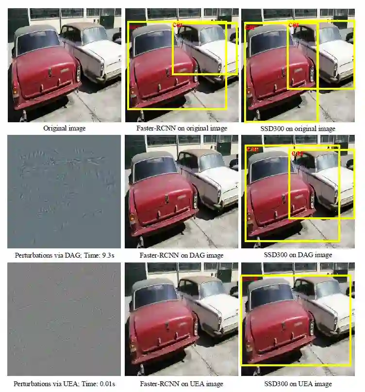 第一行为原始图像及其目标检测结果;第二行和第三行分别为 DAG 方法和 UEA 方法添加扰动后的对抗图片在两种目标检测方法上的效果;其中 DAG 扰动后使得 Faster R-CNN 未检测出图中目标,但是对 SSD 无影响;而 UEA 扰动后在 Faster R-CNN 上未检测出目标,同时在 SSD 上检测到的目标 car 被识别为 sofa
