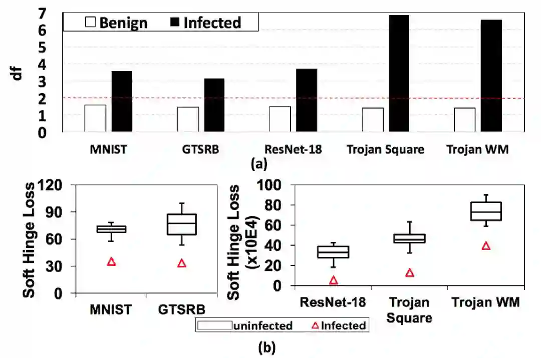 为了验证异常检测的可行性,作者使用前述 DeepInspect 的三个步骤,分别测量了良性模型和特洛伊模型的偏差因子 (df,deviation factor),结果如图 3.5(a) 所示。如果待检测模型的偏差因子大于截止阈值,则确定其被「感染」。使用显著性水平α = 0.05(对应于截止阈值 c = 2),对于所有感染模型,DeepInspect 产生的 df> 2;对于所有良性模型,df <2。且感染的 DNN 与相应的良性 DNN 之间的偏差因子差距很大,表明 df 是特洛伊木马检测的有效指标。