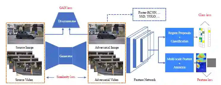 本篇论文是 IJCAI2019 的 oral 论文,论文短小精悍,图示丰富(图像目标检测、视频目标检测、消融实验证明的对比图详见原文)。这篇论文通过提出多尺度特征损失,结合先前目标检测攻击 DAG 方法中的类损失,共同提高了目标检测对抗攻击的迁移性。通过用 GAN 生成对抗样本而非迭代优化的方式,加快了攻击速度,使之也可以成功的用于视频。