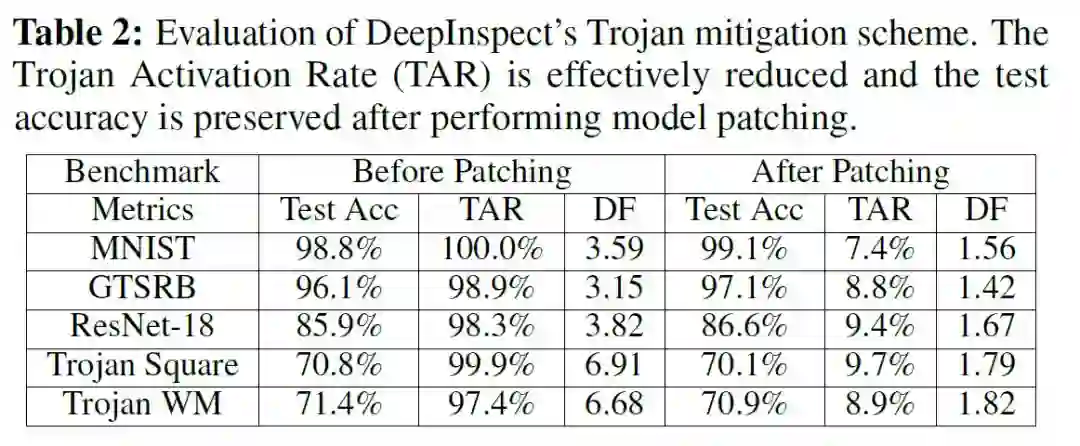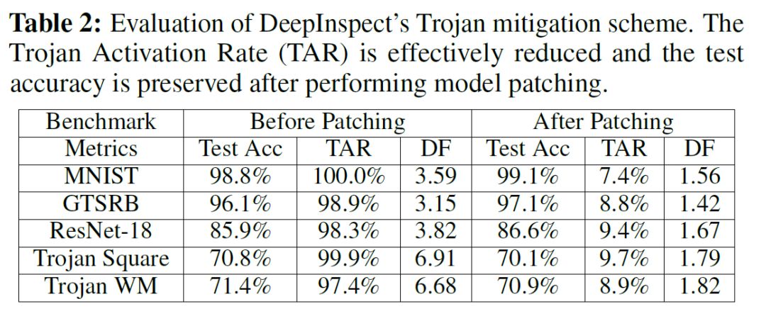 DeepInspect 通过训练条件生成器来学习潜在触发器的概率密度分布,从而有效地检测到后门攻击的发生。换句话说,一旦我们完成条件 GAN 的训练,我们就有了一个能够为任何目标类构建不同 trigger 图案的生成器,这有助于进行对抗学习,可用于提高良性模型的鲁棒性,或「修补」受感染的 DNN 以禁用特洛伊木马攻击。作者将反向训练集 {X_MI,Y_MI} 和修补后的数据集 {X_patch,Y_patch} 混合,微调 Trojaned DNN 来执行模型修补,修补结果如 Table2 所示。可以看到,作者提出的特洛伊木马缓解方案有效地降低了触发器的激活率,同时保留了模型在正常数据集中的表现。通过修补 df 小于等于 DeepInspect 异常检测截止阈值 c 的模型,从而能够通过模型的鲁棒性检查进行安全部署。作者还强调,如果有干净的数据,修补后的特洛伊激活率可以进一步降低到∼3%。