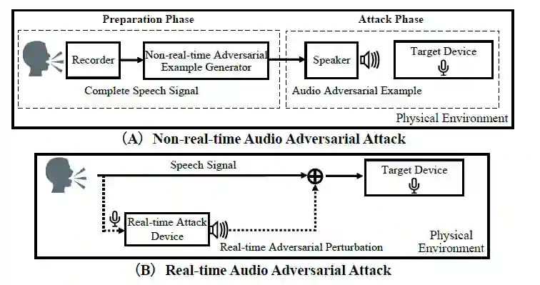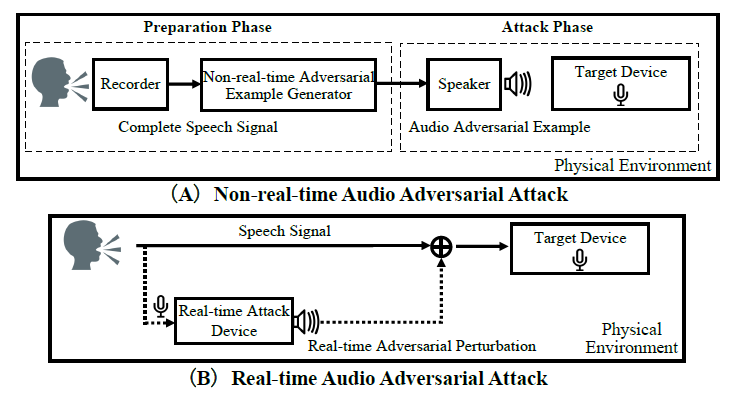 图 2.3(A)非实时语音对抗攻击(B)实时语音对抗攻击