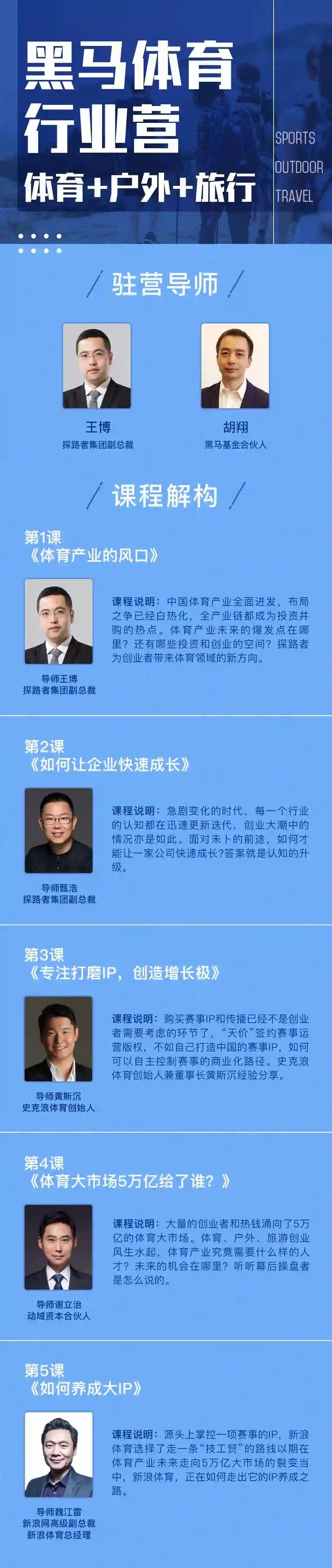 他们或最懂体育行业的资深企业家,或是优秀的体育行业投资人......他们不仅会为创业者带来最新的行业趋势分析,还将分享创业这些年,那些积累的经验和趟过的坑。
