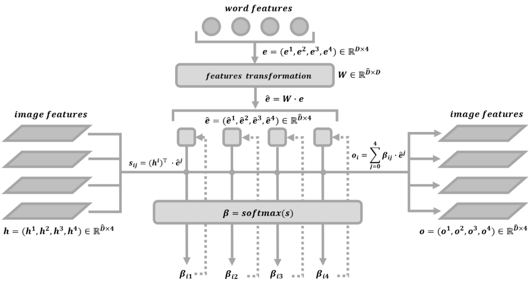 AttnGAN 通过利用注意力机制来实现多阶段细颗粒度的文本到图像的生成,它可以通过关注自然语言中的一些重要单词来对图像的不同子区域进行合成。比如通过文本“一只鸟有黄色的羽毛和黑色的眼睛”来生成图像时,会对关键词“鸟”,“羽毛”,“眼睛”,“黄色”,“黑色”给予不同的生成权重,并根据这些关键词的引导在图像的不同的子区域中进行细节的丰富。AttnGAN 中注意力机制的操作原理如上图所示。