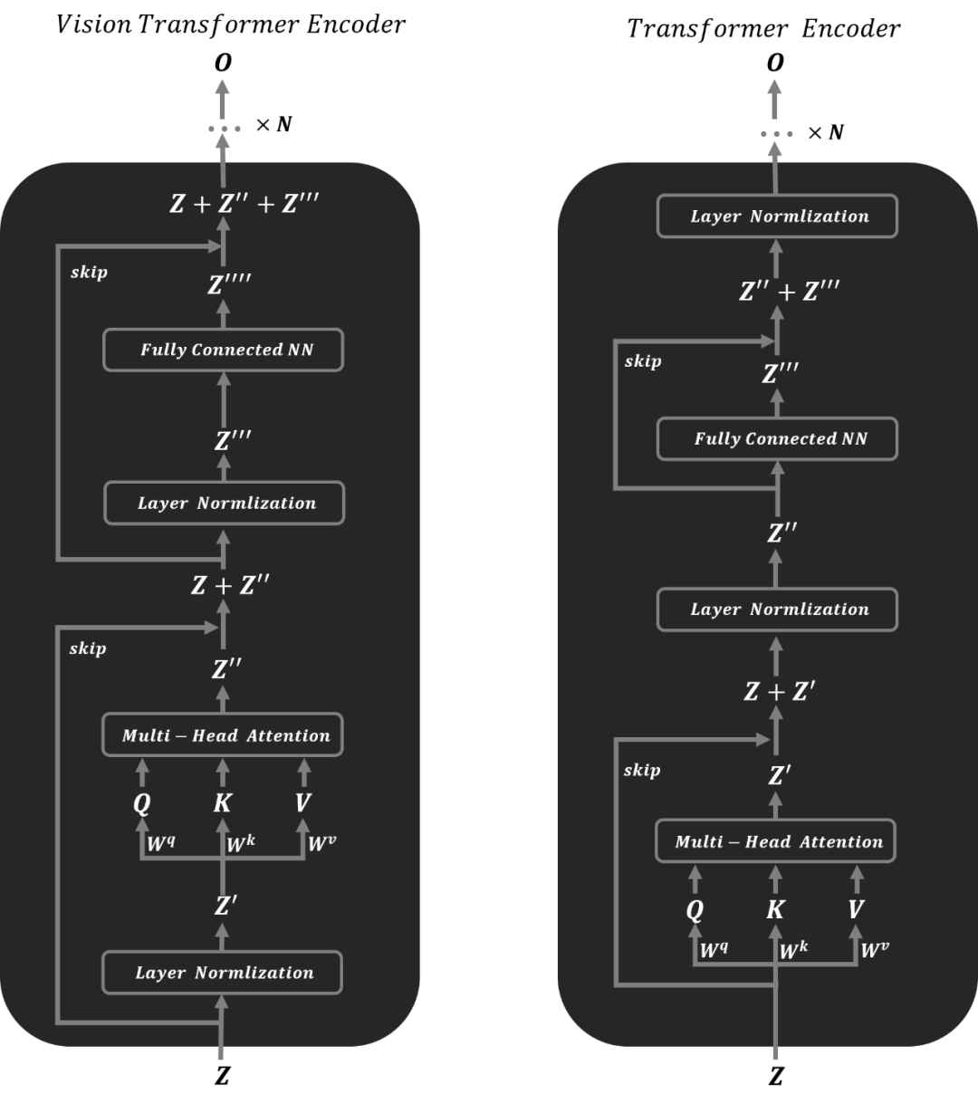如下图所示分别为 Vision Transformer Encoder 模型结构图和原始 Transformer Encoder 的模型结构图。可以直观的发现 Vision Transformer Encoder 和 Transformer Encoder 都有层归一化,多头注意力机制,残差连接和线性变换这四个操作,只是在操作顺序有所不同。在以下的 Transformer 代码实例中,将以下两种 Encoder 网络结构都进行了实现,可以发现两种网络结构都可以进行很好的训练。