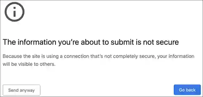 如果你无视提示警告继续提交表单信息,则会看到一个确认警告页面,告知你即将提交的信息 并不安全。可见 Chrome 在应对一些新兴网络安全风险这件事情上还是相当敏感的。