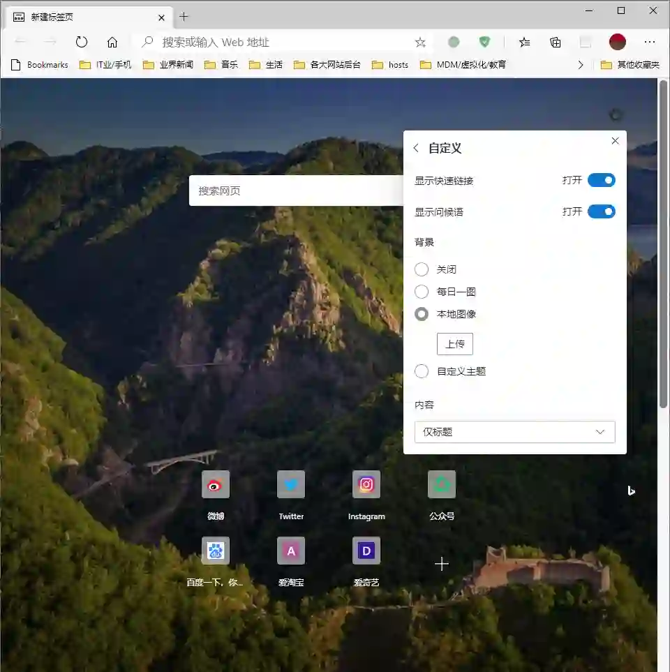 Edge 浏览器最大的亮点之一应该就是必应壁纸了,在 Edge 86 中,我们还可以自定义标签页背景了。所以如果你对微软的必应壁纸不够满意,也可以选择自己喜欢的壁纸作为标签页背景。
