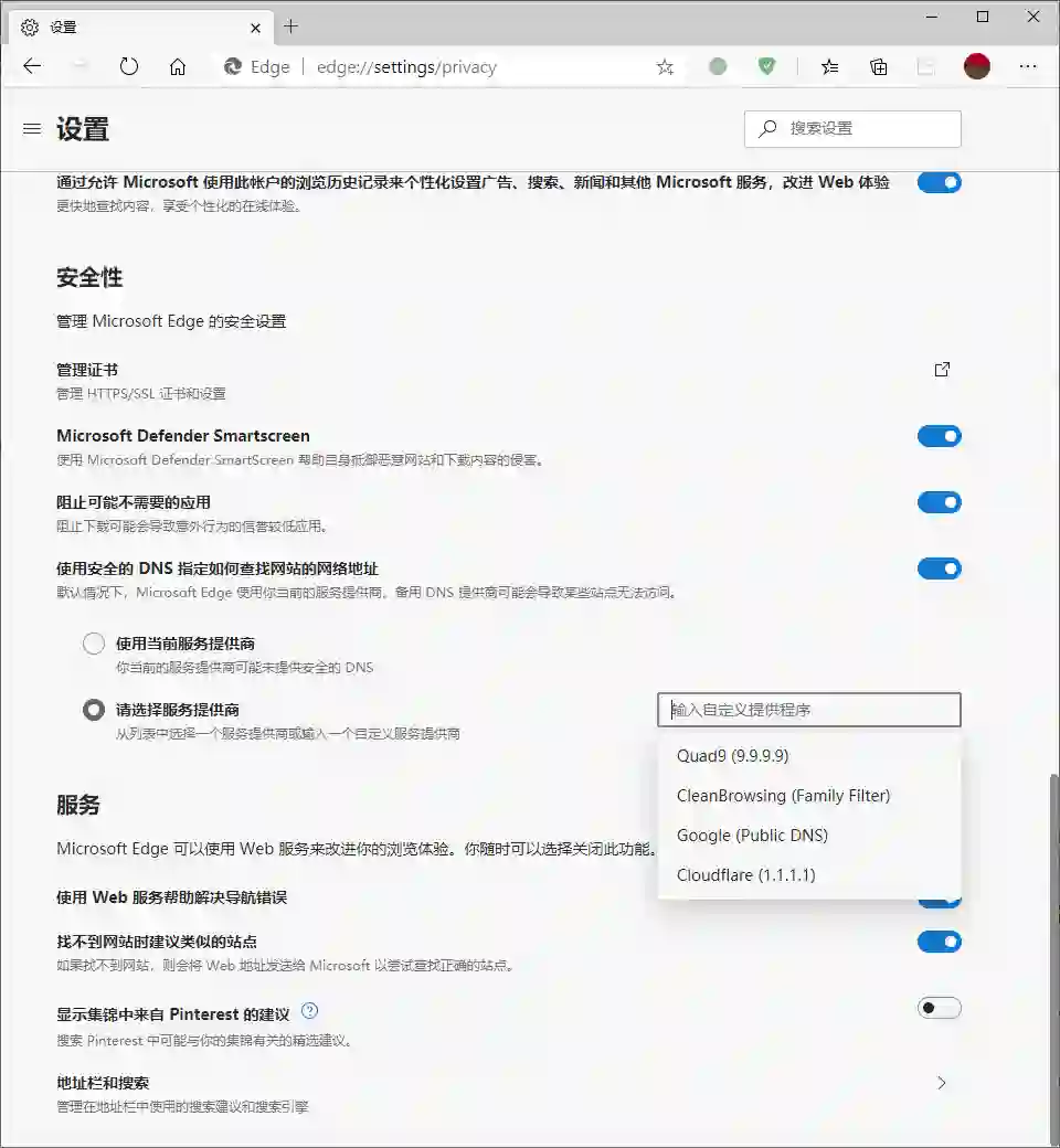 在 Edge 86 中,微软为我们带来了安全 DNS 功能选项,除了可以继续使用当前的服务提供商(即和操作系统网络设置保持一致)外,我们还可以选择特定的安全 DNS。这里 Edge 86 内置了 Google 、CloudFlare 的安全 DNS,用起来还是相当简单方便的。