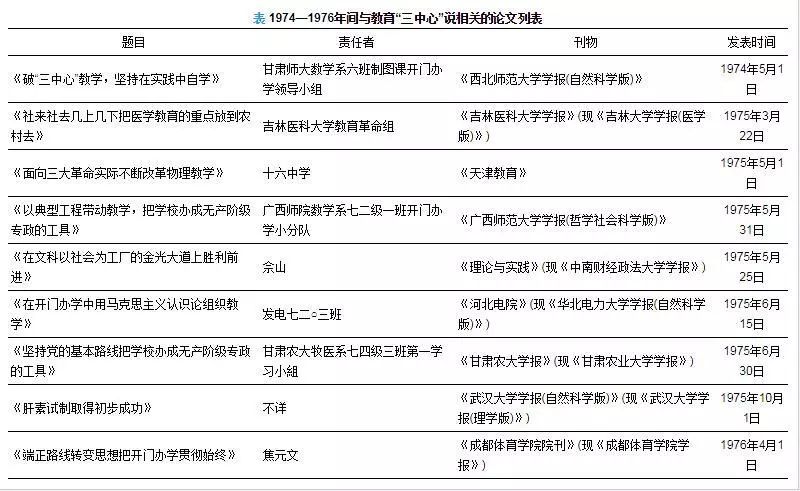 自1974年起,“文革”期间发表的一些相关论文,无一不是在反对教育“三中心”说。根据中国知网(CNKI)提供的资料信息,我们将这些论文的具体情况统计如下:
