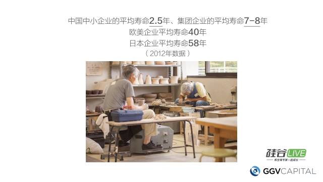 马云提过这样子数据,比较一下中国企业的平均寿命和日本的企业寿命。以2012年的数据来看,中国企业的平均寿命是2.5年,集团企业长一些有7到8年;欧美呢已经比较不错了,大概企业平均寿命是40年。