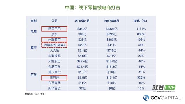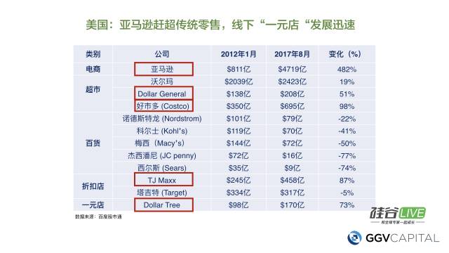 我们把美国各种零售类别下的公司——电商、超市、百货、一元店和折扣店等都做了分析,比较他们2012年的市值和2017年的市值的变化。