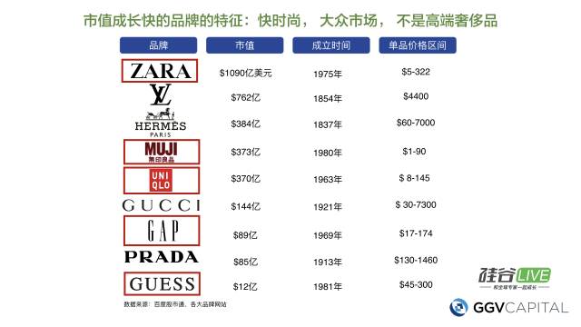 我们发现一些做大众市场的公司,像欧洲的ZARA,日本的无印良品和优衣库,美国的GAP和Guess等,他们只花了30到40年的时间,市值已经接近甚至超过了成立100年以上的奢侈品市场公司,如Hermes,LOUIS VUITTON。