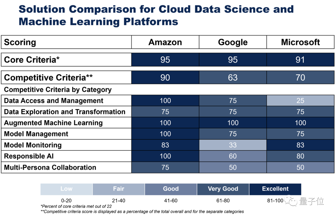 其中Amazon SageMaker作为一个综合性的数据科学和机器学习平台,凭借着包括JumpStart在内的强大的端到端DSML全生命周期功能,获得了核心标准95分,竞争标准90分的高分。