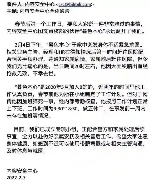 【B站回应“员工春节加班猝死”:已成立专项小组配合善后】针对网传B站员工春节加班猝死一事,B站武汉发布内部信表示,内容安全中心图文审核部的伙伴“暮色木心”因大面积脑出血经抢救无效,不幸去世。内部信否认该员工因加班猝死,称其工作时间为09:30-18:30,在事发前一周内未存在加班等情况。目前,公司已成立专项小组,配合处理后续事宜。(贝壳财经)
