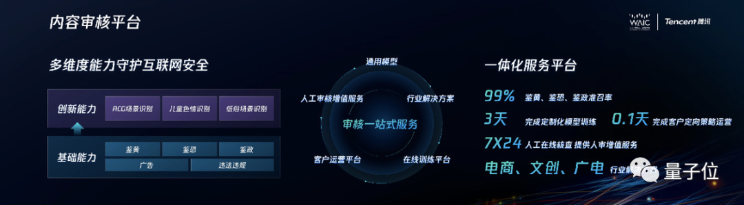 通过不断打磨内容审核的基石,优图内容审核平台,提供审核一站式服务,鉴黄、鉴恐、鉴证准召率超过99%。