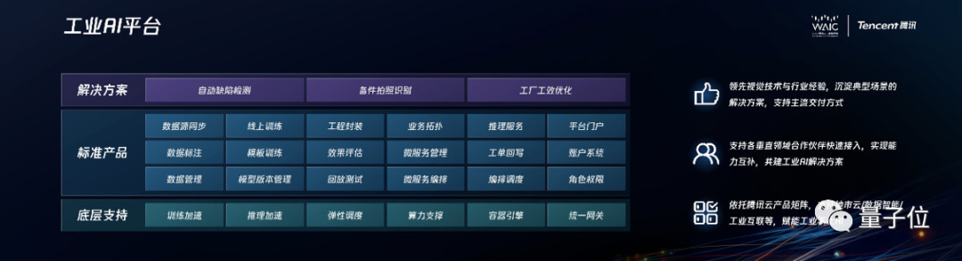 在平台层,腾讯云打造了「一云三平台」的新基建布局,通过腾讯云等对外开放AI能力,借力算法平台、服务平台以及开放平台,降低AI的应用门槛,实现AI技术的场景落地。