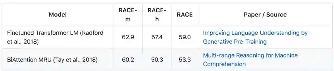 RACE 数据集是一个从中国初中和高中英语测试收集的阅读理解数据集。该数据集包含 28000 多篇短文和近 100000 条问题。模型可基于中学测试(RACE-m)、高中测试(RACE-h)和完整数据集(RACE)使用准确率进行评估。