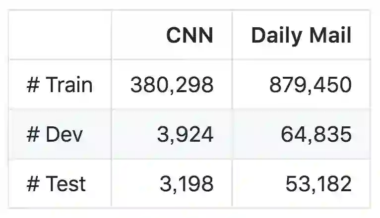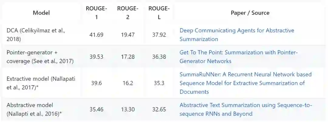 CNN / Daily Mail 数据集是由 Nallapati et al. (2016) 处理并发布,它已经用于评估自动摘要。该数据集包含带有多句摘要(平均 3.75 个句子或 56 个词)的再现新闻文章(平均 781 个词)。经处理的版本包含 287226 个训练对、13368 个验证对和 11490 个测试对。模型基于 ROUGE-1、ROUGE-2 和 ROUGE-L 进行评估,* 表示模型在匿名数据集上进行训练与评估。