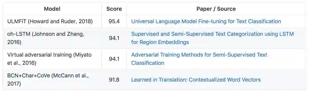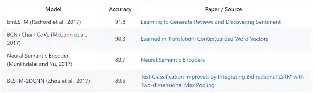 IMDb 是一个包含 50000 条评论的二元情感分析数据集,评论都来自与互联网电影数据库(IMDb),且标注为积极或消极两类。模型同样通过准确率进行评估。