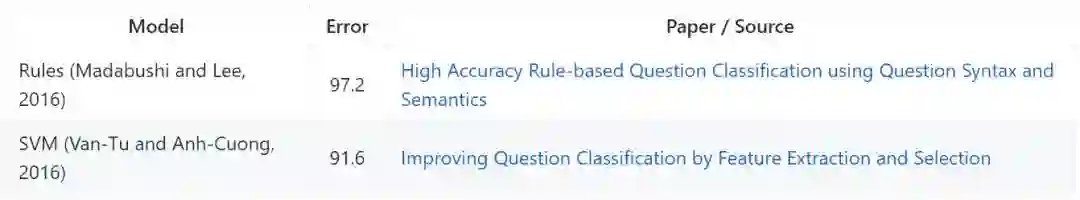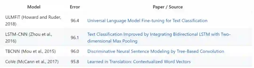 TREC(《The TREC-8 Question Answering Track Evaluation》)是用于问题分类的数据集,包含开放域、基于事实的问题,并被分成广泛的语义类别。它有六类别(TREC-6)和五类别(TREC-50)两个版本。它们都有 4300 个训练样本,但 TREC-50 有更精细的标签。模型基于准确率评估。