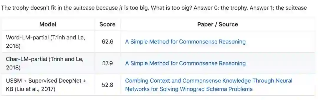 Winograd Schema Challenge 是一个用于常识推理的数据集。它使用 Winograd Schema 问题以要求人称指代消歧:系统必须明确陈述中有歧义指代的先行词。模型同样基于准确率评估。