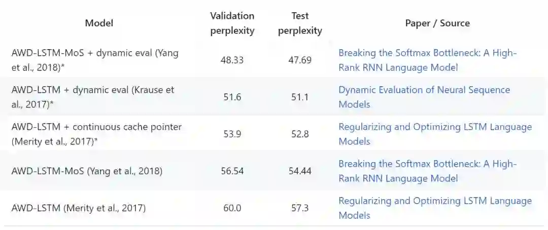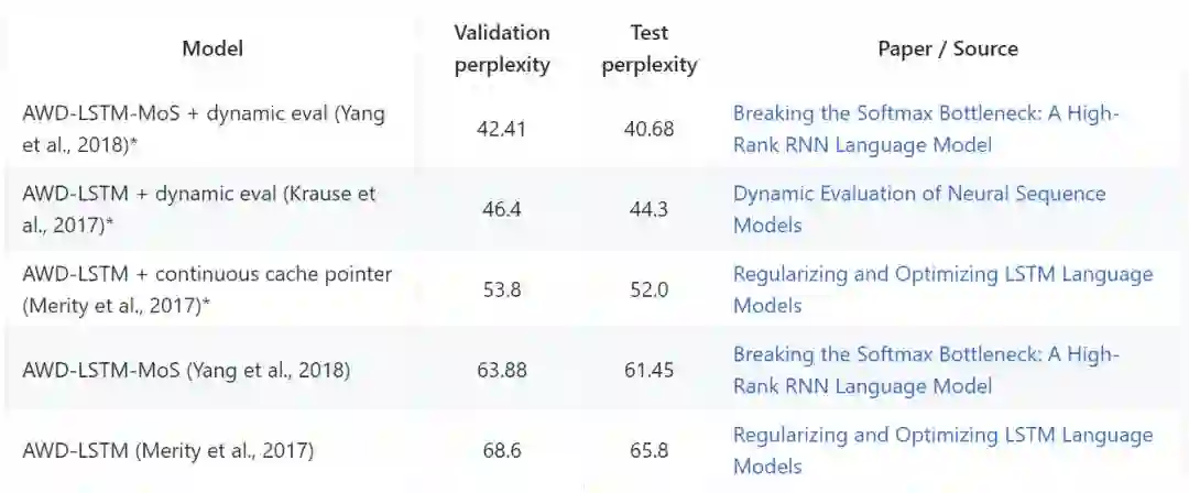 语言建模的常用评估数据集是 Penn Treebank,已经过 Mikolov 等人的预处理(《Recurrent neural network based language model》)。该数据集由 929k 个训练单词、73k 个验证单词和 82k 个测试单词构成。作为预处理的一部分,单词使用小写格式,数字替换成 N,换行符用空格表示,并且所有其它标点都被删除。其词汇是最频繁使用的 10k 个单词,并且剩余的标记用一个标记替代。模型基于困惑度评估,即平均每个单词的对数概率(per-word log-probability),越低越好。